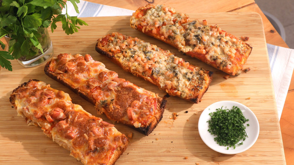 Corta la barra de pan por la mitad y divide cada parte en dos para obtener cuatro paninis.