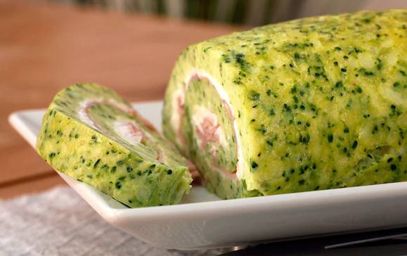 Sirve el rollo de tortilla de brócoli con jamón y queso y decora con cebollino picado.